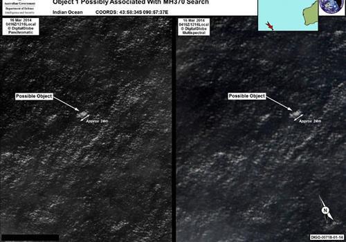 Os satélites mostraram imagens de dois objetos, um deles com 24 metros de comprimento, que podem estar relacionados ao voo MH370 da Malaysia Airlines, que desapareceu há 12 dias com 239 pessoas a bordo.