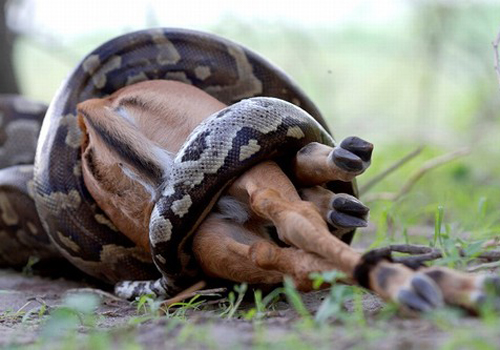 Uma píton conseguiu abater um antílope no Parque Nacional Moremi (Botsuana). A cobra de 2,5 metros devorou a presa inteira, levando 45 minutos para desaparecer com o antílope pela boca. A píton tem mandíbulas extremamente flexíveis e músculos poderosos. Elas costumam matar as presas por sufocamento. O registro foi feito pelo fotógrafo Fred von Winckelmann.