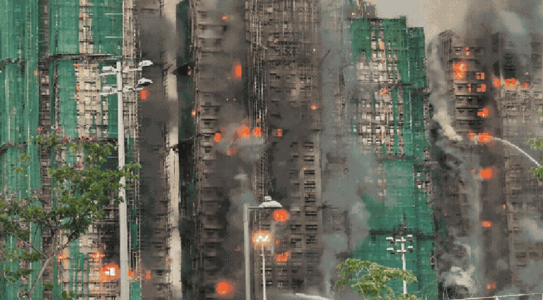 Ao redor do prédio, diversas torres exibiam andaimes de bambu — estrutura comum em Hong Kong — que pode dificultar o trabalho das equipes ou representar risco adicional de propagação externa. Imagens mostraram o andaime totalmente tomado pelo fogo, com trechos da tela verde de proteção caindo em chamas.
