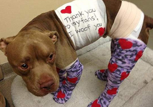 O cão precisou de 7 meses para conseguir se recuperar. Ele foi adotado por um voluntário depois de ser entregue a instituição New Hope Rescue Team. O Pitbull precisou de várias cirurgias de reconstrução e enxerto de pele.