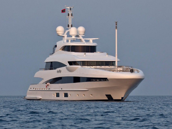 O iate chamado MySky tem 'interiores sofisticados ultramodernos' desenhados por um arquiteto holandês, uma 'academia interna com clima controlado' e um deck que pode ser usado para pouso de helicópteros, de acordo com o anúncio.