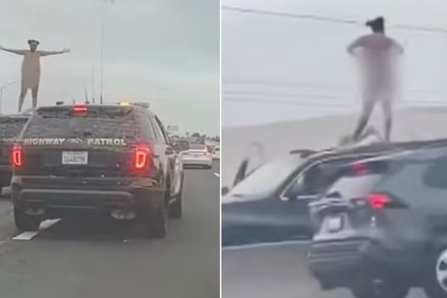 Uma cena inusitada surpreendeu os motoristas que trafegavam por uma movimentada rodovia na Califórnia (EUA) na última quarta-feira (5), isso porque uma mulher decidiu retirar a roupa e subir completamente nua no teto de um carro modelo SUV.