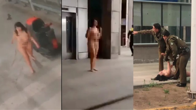 Uma mulher não identificada, foi flagrada completamente nua e constrangendo o público de um aeroporto, no Chile. De acordo com as testemunhas, ela corria de forma ameaçadora em direção aos policiais que tentavam detê-la. Durante a abordagem das autoridades ela teria ainda, agredido um deles.