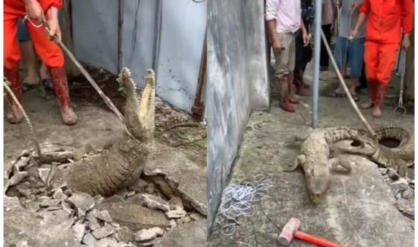 Na gravação feita por um morador, é possível ver um homem segurando uma espécie de equipamento enquanto tenta capturar, sem sucesso, um dos crocodilos. Logo em seguida, um outro animal também sai de um buraco e caminha rapidamente em direção a pessoa que registrava o momento. O indivíduo então, automaticamente procura se proteger do animal e se apoia em um poste, causando uma grande gritaria no local.