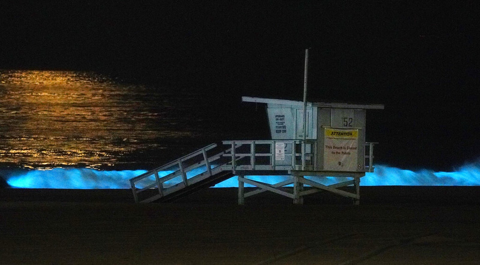 Um fenômeno natural, conhecido como "maré vermelha", iluminou as praias do sul da Califórnia na noite de segunda-feira (27). Apesar do nome, o que se viu na costa oeste dos Estados Unidos foram ondas "tingidas" com uma coloração azul-metalizada.