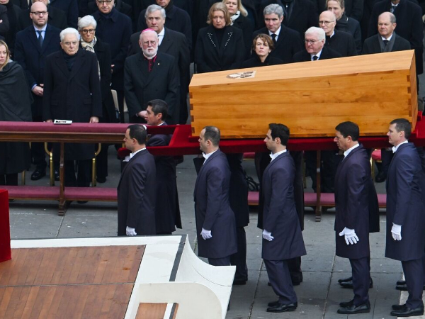 O caixão simples de madeira com os restos mortais de Joseph Ratzinger, que carrega uma cópia dos Evangelhos, foi colocado no altar instalado no átrio da basílica, à qual o papa Francisco chegou em uma cadeira de rodas.