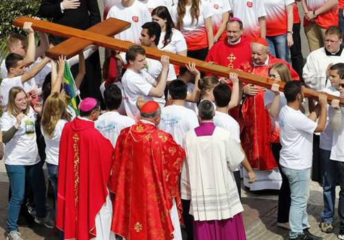 Pouco antes, o Sumo Pontífice presidiu a procissão de Ramos, apoiado em um bastão esculpido para a ocasião pelos detentos do presídio de San Remo (centro-oeste da Itália), e cercado por dezenas de jovens padres e bispos. Já no fim da missa, jovens brasileiros entregaram uma grande cruz de madeira que foi usada na Jornada Mundial da Juventude no ano passado no Rio para jovens da Polônia, que vai sediar o evento em 2016 na cidade de Cracóvia.