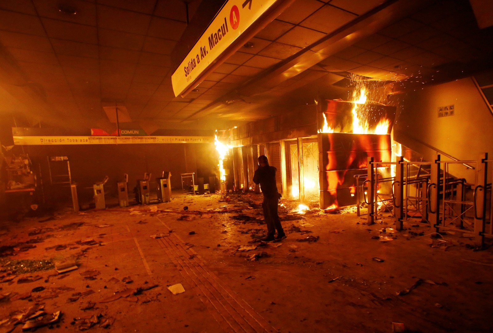 Manifestantes foram em massa para as estações de metrô e forçaram a entrada sem pagar, causando destruição e enfrentando a polícia. A situação forçou o metrô de Santiago, que transporta diariamente quase 3 milhões de pessoas, a fechar todas as estações na sexta-feira, o que levou ao colapso do sistema de transporte da cidade.