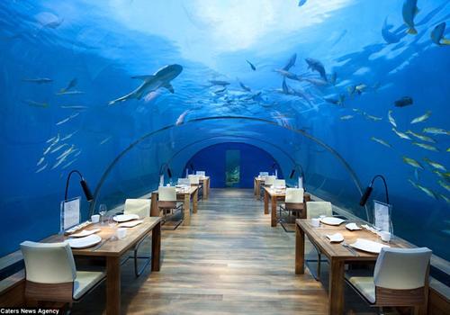 O restaurante 5 estrelas no Conrad Maldives Hotel chama a atenção por oferecer aos clientes uma visão deslumbrante do fundo do mar. Ele possui janelas de vidro do chão ao teto, e coloca os clientes cinco metros abaixo do Oceano Índico.