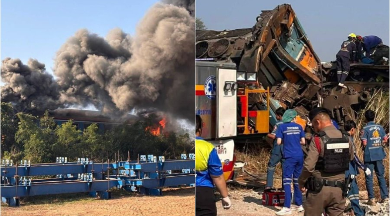 O trem, que seguia da capital Bangkok para o nordeste do país, descarrilou e pegou fogo após ser atingido pelo guindaste. Conforme a polícia, o incêndio já foi controlado, enquanto os trabalhos de resgate continuam no local.