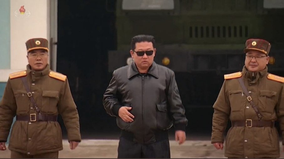 Nas imagens veiculadas, o ditador Kim Jong-un aparece com um estilo do ator Tom Cruise em "Top Gun": jaqueta de couro e óculos escuros de estilo aviador andando no meio de dois militares e à frente do lançador gigantesco do míssil.