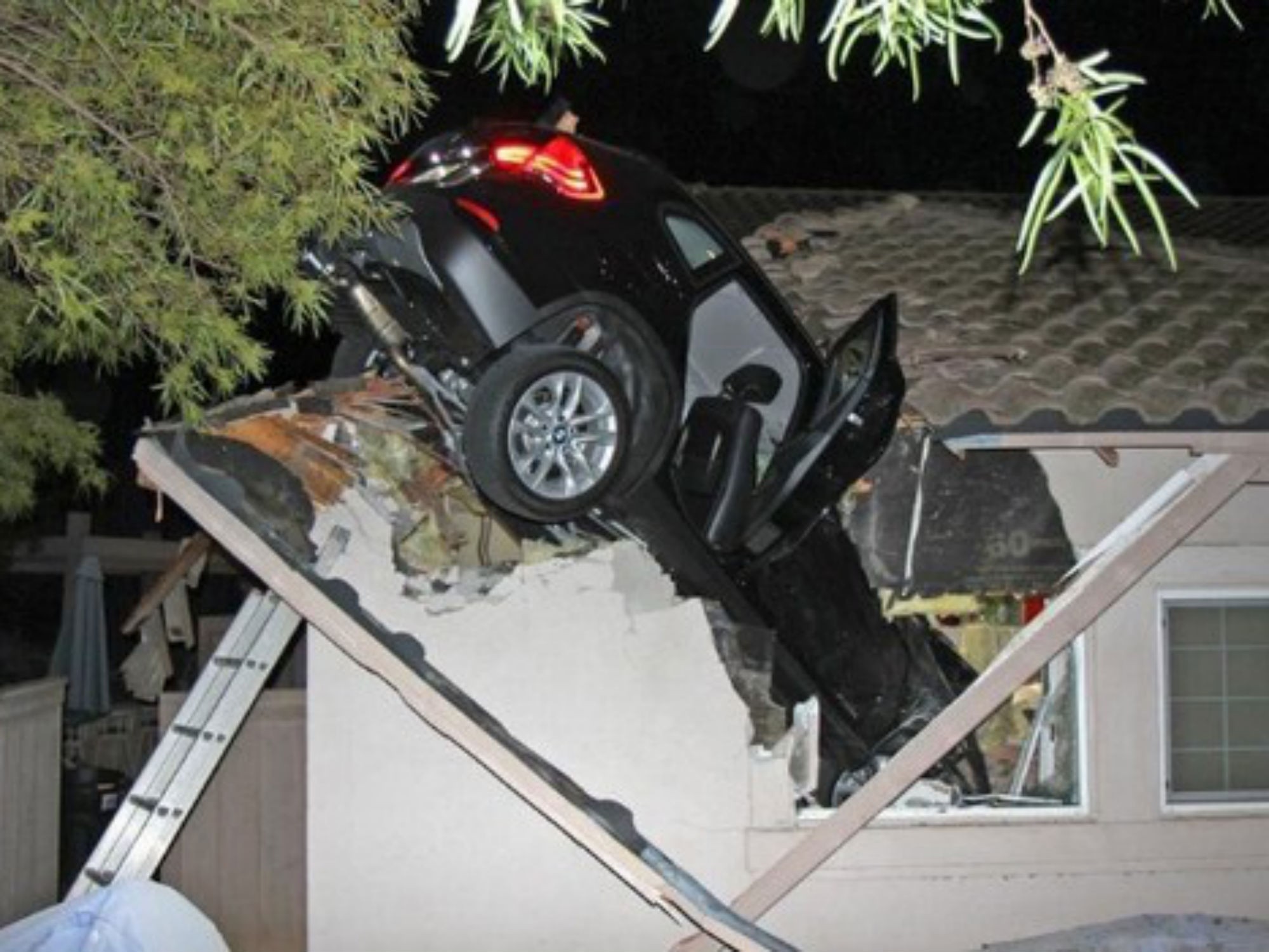 O motorista de uma BMW perdeu o controle do veículo em estrada de Escondido (Califórnia, EUA) e acabou atravessando o telhado de uma residência situada seis metros abaixo do nível da estrada.