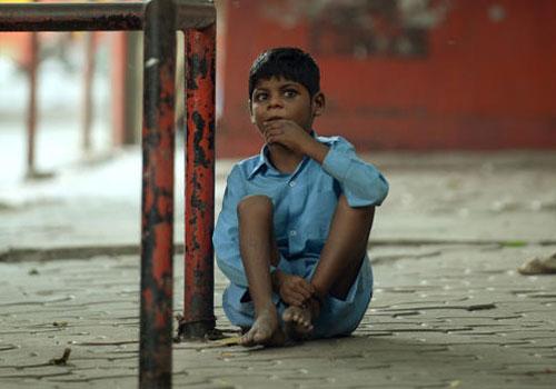 Uma escaldante calçada de Mumbai chama a atenção. Nela, um menino de nove anos, vestido de azul, sentado no chão com o tornozelo amarrado com uma corda a um ponto de ônibus onde há diversos pedestres.