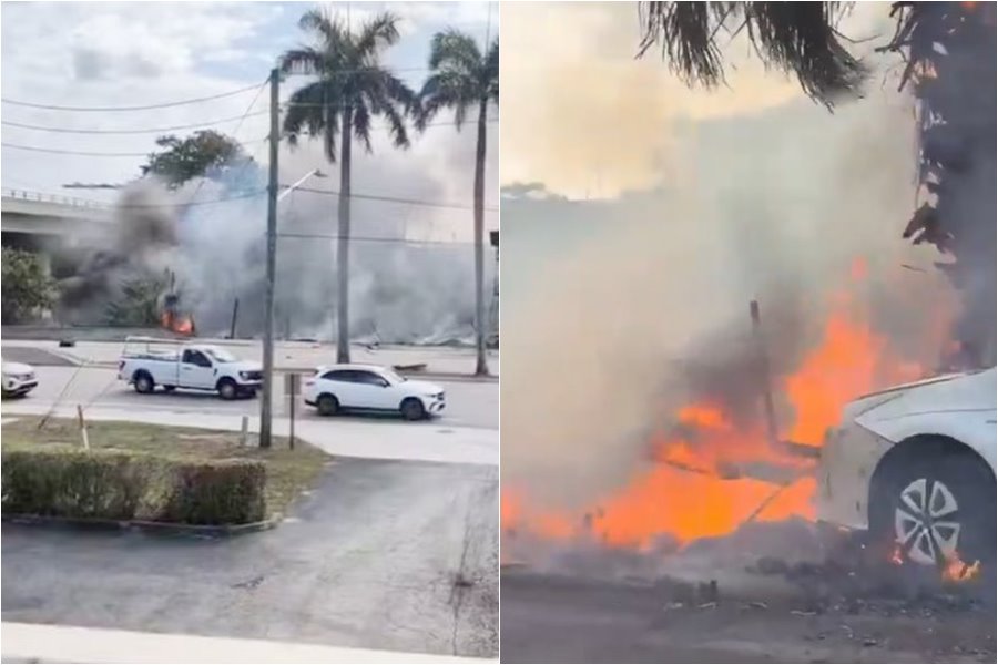 Nove minutos depois, o Departamento de Polícia de Boca Raton confirmou o acidente nas redes sociais, informou sobre a interdição da área e que se tratava de uma aeronave de pequeno porte. Imagens aéreas de uma emissora local mostraram destroços espalhados pela rua e trilhos do trem, enquanto bombeiros atuavam no local.
