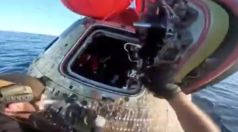 Já a cápsula Orion foi içada e colocada dentro da embarcação, onde ficará protegida até o retorno à base naval de San Diego.