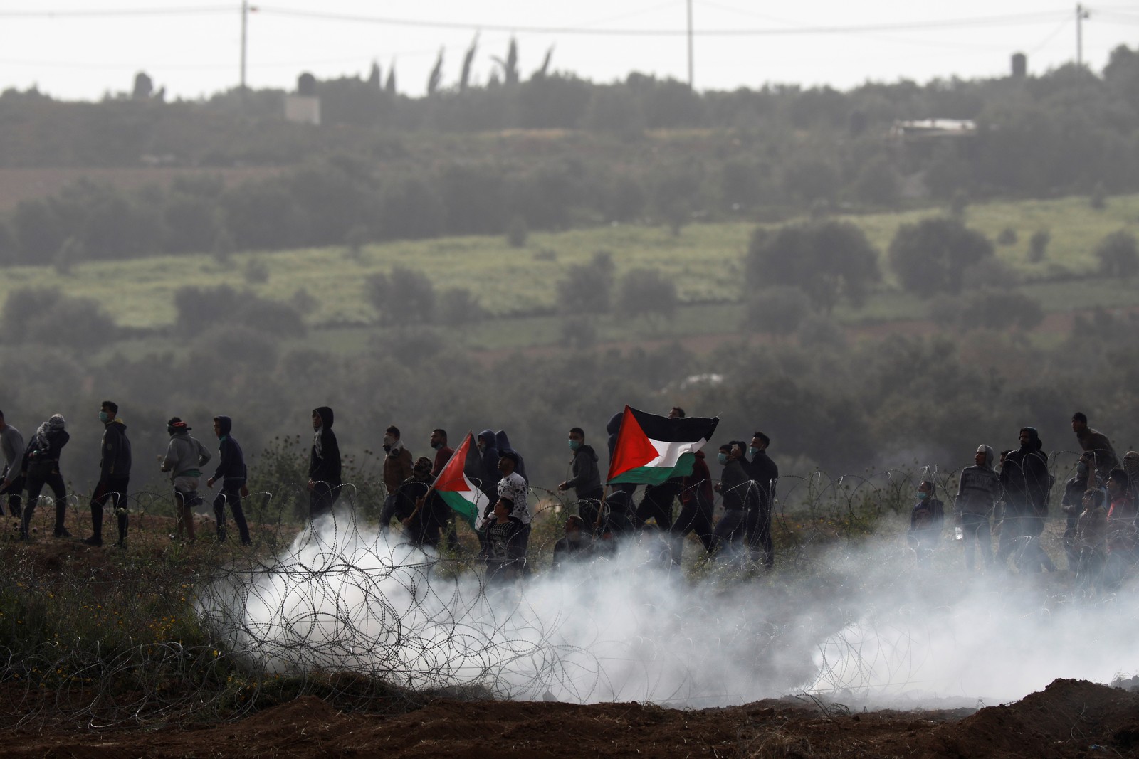 Os palestinos participavam de manifestação na área fronteiriça com bandeiras da Palestina no primeiro aniversário da mobilização "Grande marcha do retorno" – protesto de palestinos que terminou em confrontos há exatamente um ano. Segundo o Exército de Israel, havia 40 mil "manifestantes violentos" na marcha deste sábado.
