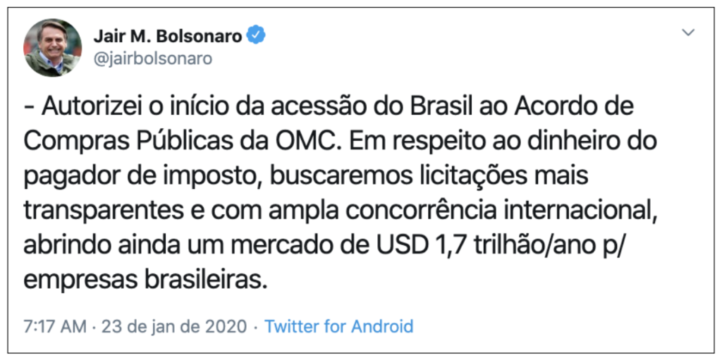 O presidente Jair Bolsonaro informou nesta quinta-feira (23.jan.2020), por meio da sua conta do Twitter, que autorizou a adesão do Brasil ao Acordo de Compras Públicas da OMC (Organização Mundial do Comércio). O dispositivo permite que empresas estrangeiras participem de licitações e de concorrências públicas em território brasileiro.