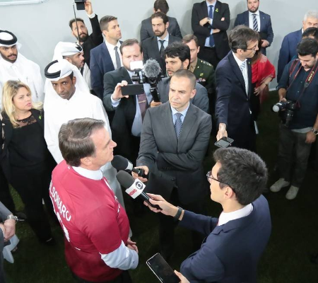 Visivelmente mal-humorado, o que não acontecia desde o início da viagem ao Oriente Médio, Bolsonaro se recusou pela segunda vez a responder sobre a reação do Supremo ao tuíte de ontem. Ao chegar de sua agenda com o príncipe saudita, o presidente se aproximou da imprensa dizendo: