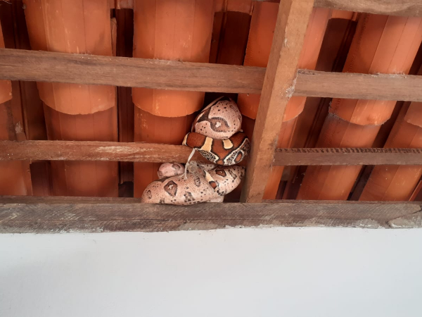 Uma jiboia de aproximadamente 1 metro e meio foi resgatada, nesta sexta-feira (28), do telhado de uma residência na Rua Ademar Mendes, no centro de Campo Maior, no Norte do Piauí. Uma professora acionou a Defesa Civil do município, que realizou a captura do animal.