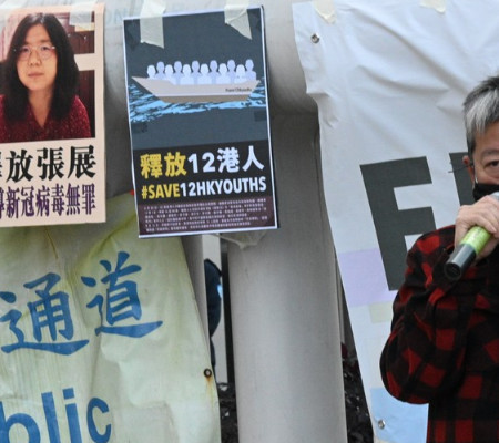 O ativista pela democracia Lee Cheuk-Yan protesta pedindo liberdade à Zhang Zhan (em foto no pôster à esquerda)