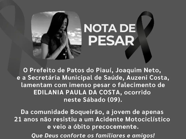 A prefeitura de Patos do Piauí por meio do prefeito Joaquim Neto e da secretária municipal de Saúde, Auzeni Costa, emitiram uma nota de pesar em solidariedade à família e os amigos.