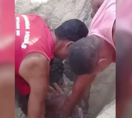 Outras pessoas também aparecem no vídeo ajudando a cavar o local e, por fim, a retirar o jovem, que estava bastante enterrado e já desacordado.
