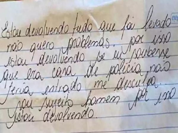 "Estou devolvendo tudo que foi levado, não quero problemas. Por isso estou devolvendo, se eu soubesse que era casa de polícia não teria entrado, me desculpa. Sou sujeito homem por isso estou devolvendo", dizia o bilhete.