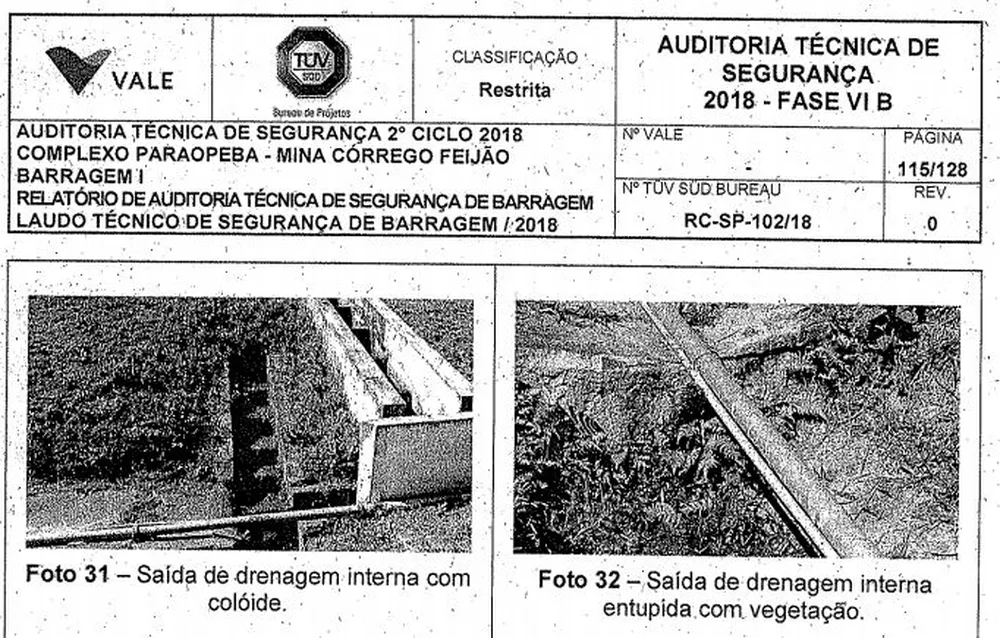 O laudo foi feito pela empresa alemã Tüv Süd, a pedido da Vale, e conclui pela estabilidade da estrutura. Mas registra que, em determinada área da barragem que estava parcialmente saturada de água, havia um dreno seco. Outros continham trincas de onde vertia água.