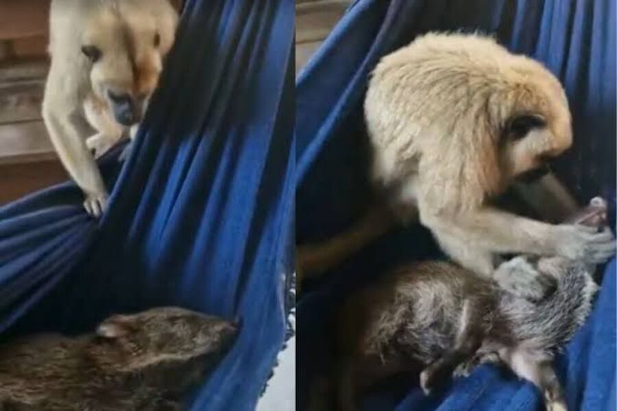 Um porco-do-mato resolveu tirar uma sonequinha daquelas numa rede de uma pousada, mas acabou sendo acordado de maneira bem inusitada por um macaco danado.