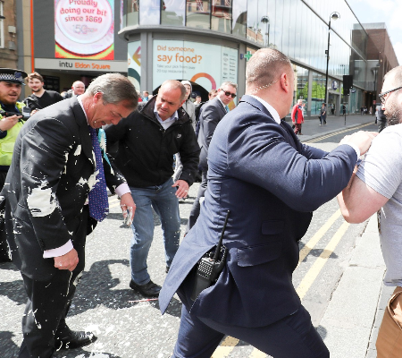 O líder do partido do Brexit, Nigel Farage, foi atingido por um copo de milk-shake de banana e caramelo salgado no centro da cidade de Newcastle. As informações são do G1.