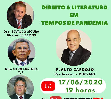 Acontece nesta quarta-feira (17/06), a partir das 19 horas, no canal no Youtube da Escola Superior da Magistratura do Estado do Piauí - ESMEPI, uma live sobre Direito e Literatura, em que figura como expositor principal, o Professor/Doutor Plauto Cardoso, da Universidade Federal de Minas Gerais e da Faculdade de Direito de Buenos Aires.