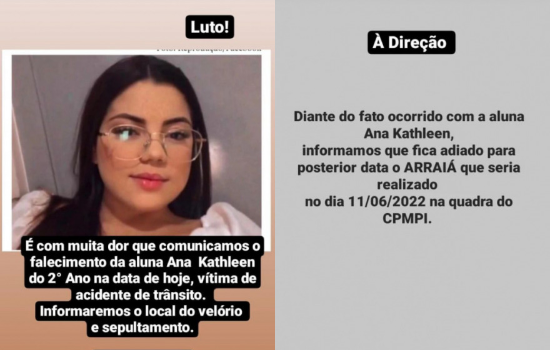 "Luto! É com muita dor que comunicamos o falecimento da aluna Ana Kathleen do 2º Ano na data de hoje, vítima de acidente de trânsito. Informaremos o local do velório e sepultamento", informou o anúncio nas redes sociais.
