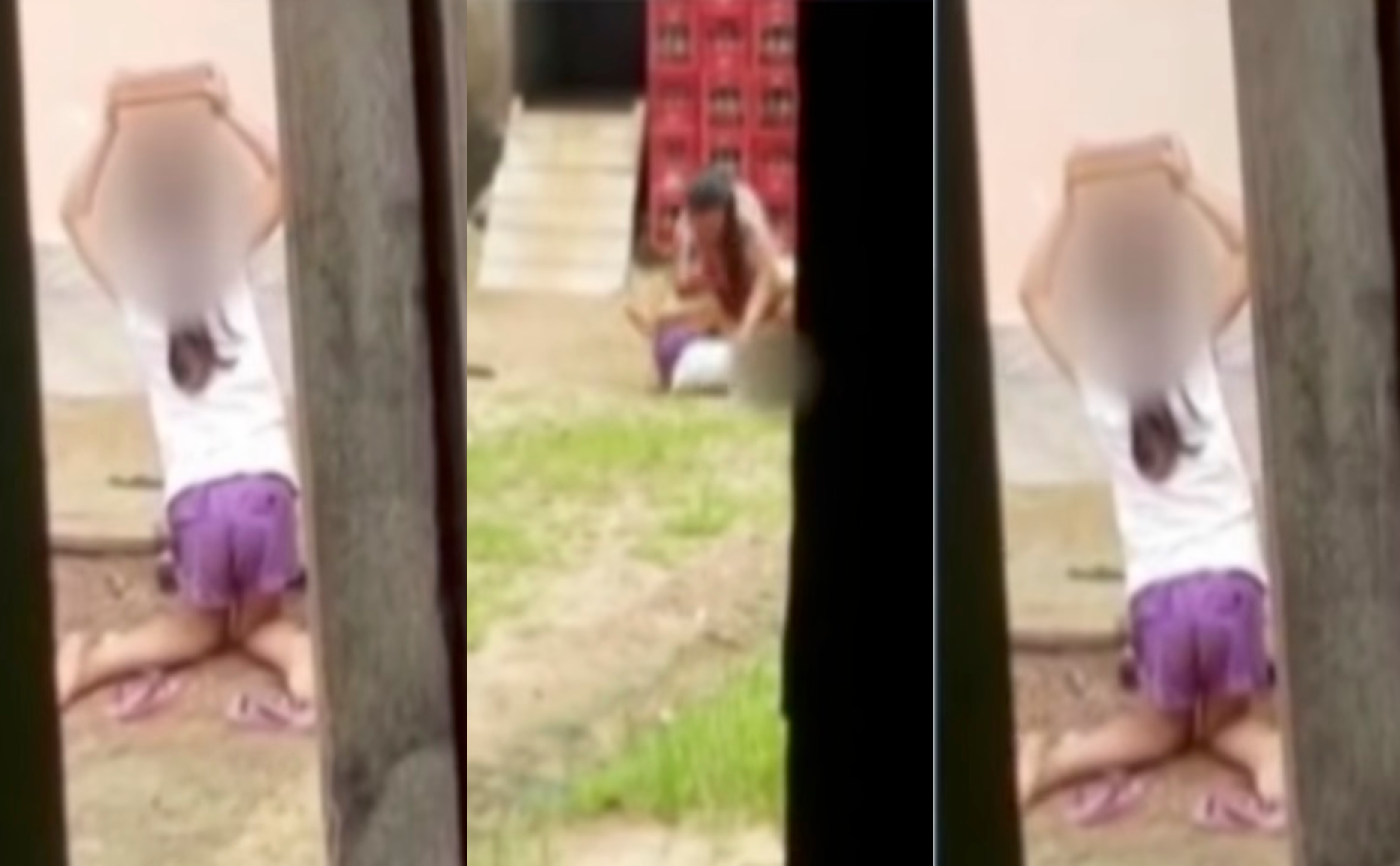 As imagens circulam nas redes sociais, mostrando a mulher batendo e sufocando a filha com um pedaço de pano. Em outro vídeo, a criança aparece de joelhos em cima de pedras, com um tijolo na cabeça. Veja no vídeo acima.
