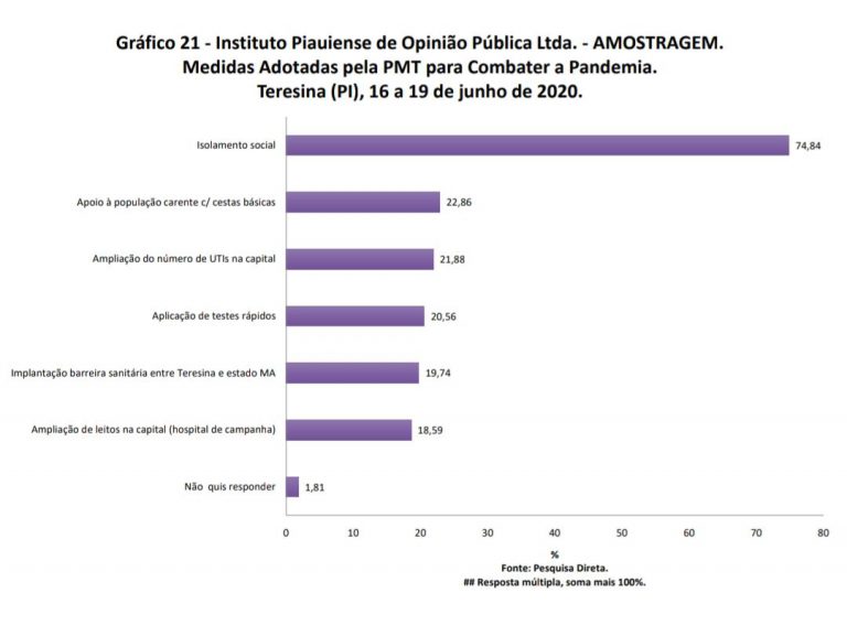 Os entrevistados também aprovam as outras ações adotadas pelo município: mais de 22% são favoráveis à distribuição de cestas básicas, 21,88% aprovam a ampliação de número de UTIs na capital, 20,56% concordam com a aplicação de testes rápidos, 19,74% aprovam a implantação barreira sanitária entre Teresina e o estado do Maranhão e 18,59% aprovam a ampliação de leitos na capital com a implantação de hospitais de campanha.