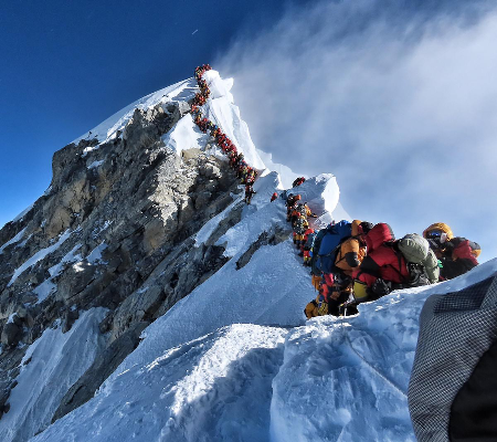 Fotos divulgadas nos últimos dias mostram uma longa fila de alpinistas, muito próximos uns dos outros, arrastando suas botas de escalada na área entre o cume e o desfiladeiro sul, onde fica o último acampamento na encosta do Nepal.