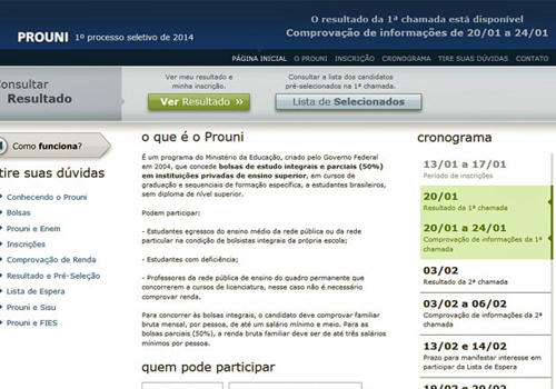O Ministério da Educação (MEC) divulgou na manhã desta segunda-feira (20) a primeira lista de selecionados pelo Programa Universidade para Todos (Prouni) com direito a bolsas de estudo no primeiro semestre de 2014. Os aprovados deverão apresentar a documentação nas universidades em que conseguiram a bolsa entre esta segunda e sexta-feira (24). Caso sobrem bolsas, o MEC fará uma segunda chamada no dia 3 de fevereiro.