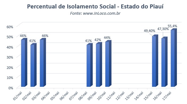 Na sexta-feira (15), o isolamento foi de 49,40%, oito pontos percentuais acima do registrado na sexta anterior (8), que foi de 41%. No sábado (16), foi de 47,30%, contra 42% do sábado, dia 9. Nesse domino (17), foi de 55,4%, mais de dez pontos acima do registrado no domingo dia 10, quando foi celebrado o Dia das Mães. Naquela data, apenas 44% da população piauiense ficou em casa.