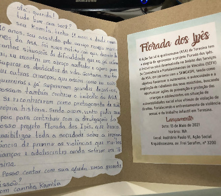 O projeto Florada dos Ipês, com lançamento marcado para o dia 13 de maio, no Auditório Paulo VI, às 16h, tem como objetivo favorecer a autonomia, autocuidado e ampliação da cidadania aos assistidos, com o objetivo de prevenir e proteger crianças e adolescentes em vulnerabilidade social de violação de direitos, violência sexual e condições de trabalho infantil, por exemplo. Para divulgar a ação, a entidade enviou um convite escrito a próprio punho por uma das assistidas.