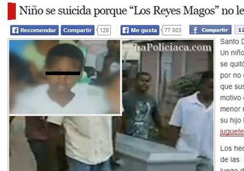 Um garoto de apenas dez anos de idade se suicidou na cidade de La Victoria, em Santo Domingo, no último dia 6 de janeiro ? Dia dos Reis Magos ? pois estava insatisfeito com os brinquedos que havia ganhado dos pais.