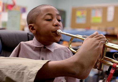 Menino que não possui os braços inspira toda a escola tocando o trompete usando os seus pés