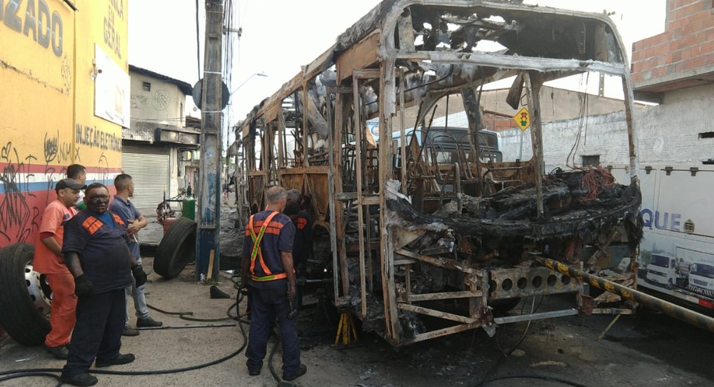 Ônibus destruído com os ataques em Fortaleza. — Foto: Halisson Ferreira/TV Verdes Mares