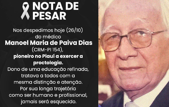 “Nos despedimos hoje (26/10) do médico Manoel Maria de Paiva Dias (CRM-PI 154), médico pioneiro no Piauí a exercer a proctologia. Dono de uma educação refinada, tratava a todos com a mesma distinção e atenção. Por sua longa trajetória como ser humano e profissional, jamais será esquecido. Aos familiares e amigos nosso pesar e solidariedade”, diz a nota.