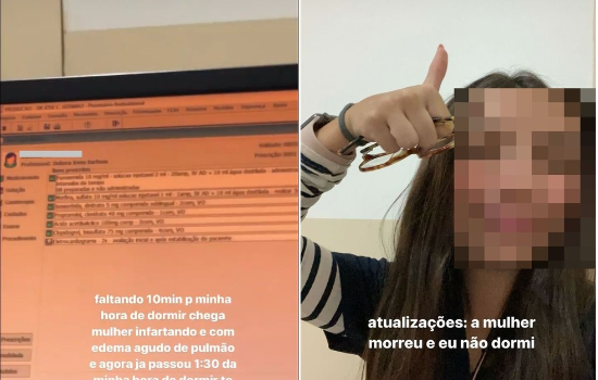 Na rede social, a jovem reclama da chegada de uma paciente com edema agudo no pulmão bem perto da hora de seu descanso. Em seguida, ela atualiza o post dizendo "a mulher morreu e eu não dormi”.