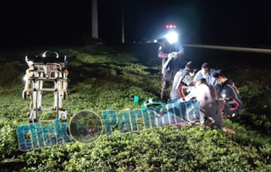 Um jovem não identificado, perdeu o controle da moto que andava e saiu da pista, após a queda, ele sofreu uma fratura exposta na perna esquerda.