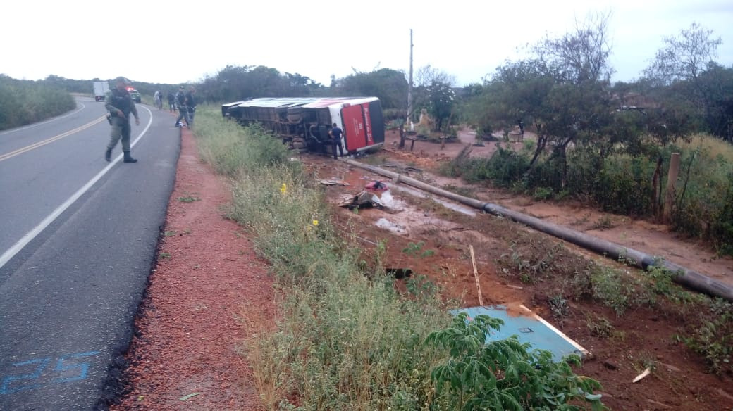 De acordo com informações, o ônibus levava 15 passageiros quando o motorista teria tentado desviar de animais na pista e perdeu o controle, vindo a descer a ribanceira e virar.