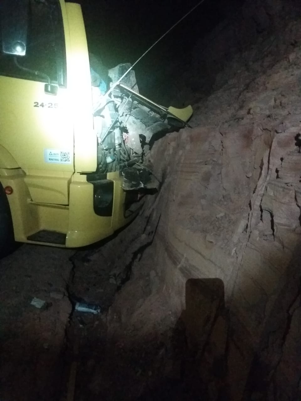 Um caminhão VW/24.250 amarelo, placas de Petrolina, saiu de pista e atingiu um barranco, ficando parcialmente sobre a via.