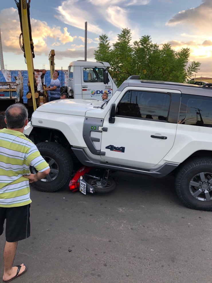 Um guindaste foi acionado para levantar o carro e retirar a moto.