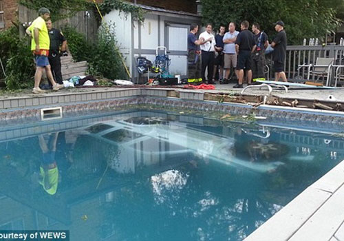 Uma mulher de 46 anos de idade caiu com um Jeep dentro da piscina de um quintal onde acontecia uma festa em Ohio, ao atravessar a cerca do quintal com o carro.