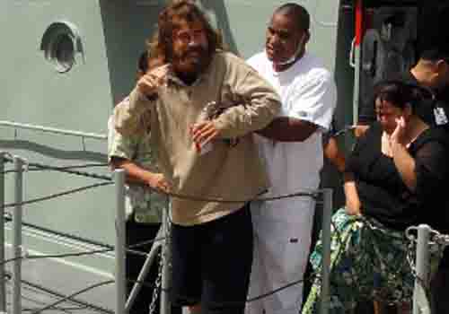 Quando dois habitantes do atol de Ebon o resgataram do mar, na quinta-feira, ele usava apenas uma cueca feita com um pedaço de pano, tinha o cabelo muito comprido e barba abundante. Além disso, não conseguia caminhar sem ajuda.