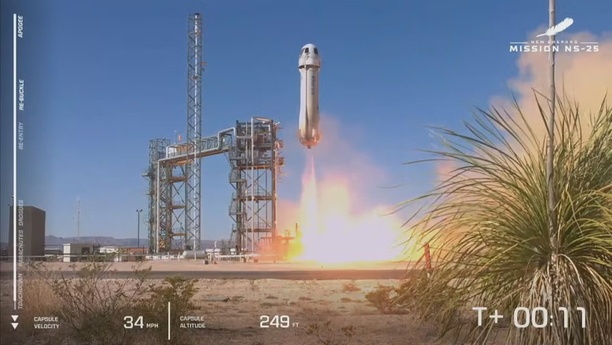 A nave New Shepard, da Blue Origin, a empresa de foguetes do bilionário Jeff Bezos, realizou com sucesso sua decolagem com seis tripulantes neste domingo (19), às 11h36. Denominada NS-25, esta missão representa o retorno das missões tripuladas com a nave New Shepard. A empresa levou seis pessoas ao espaço em um voo que teve duração de cerca de 10 minutos.